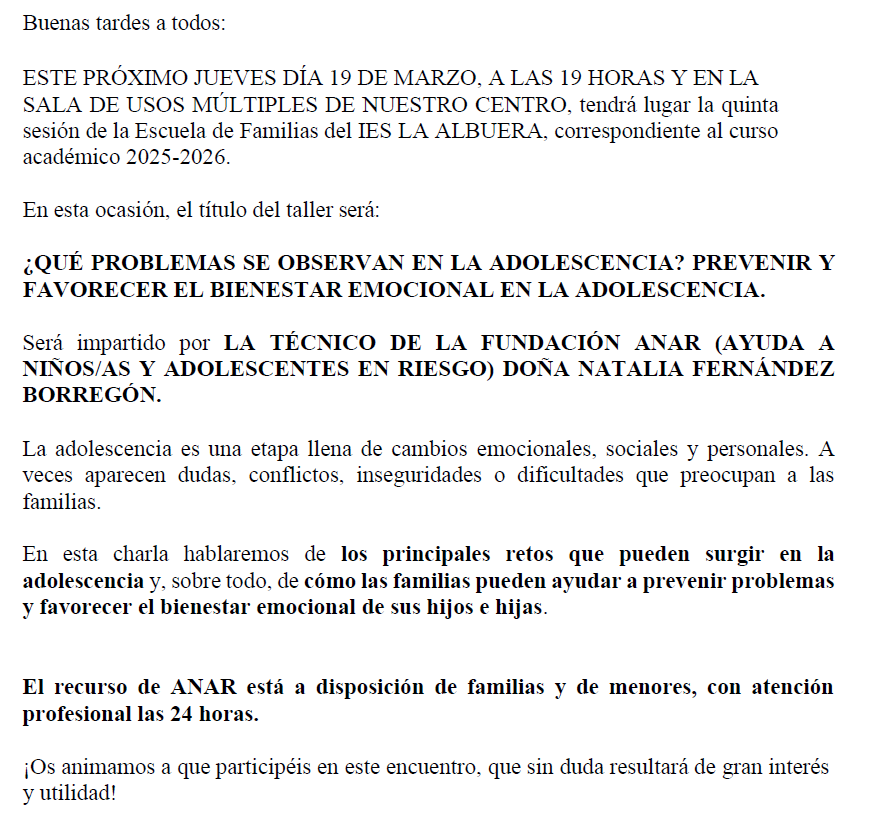 El jueves 18 de diciembre dió comienzo una nueva edición de la Escuela de Familias del IES La Albuera que este año celebra su quinto curso de funcionamiento. Este proyecto de coaprendizaje entre el equipo docente y las familias, a través del AMPA, tiene como objetivo estrechar la colaboración para favorecer el aprendizaje y el bienestar de nuestros hijos y alumnos.