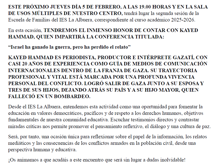 El jueves 18 de diciembre dió comienzo una nueva edición de la Escuela de Familias del IES La Albuera que este año celebra su quinto curso de funcionamiento. Este proyecto de coaprendizaje entre el equipo docente y las familias, a través del AMPA, tiene como objetivo estrechar la colaboración para favorecer el aprendizaje y el bienestar de nuestros hijos y alumnos.